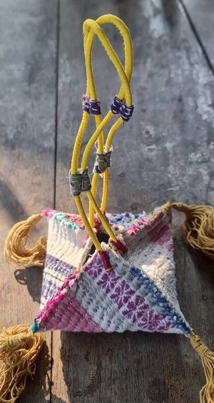 「インディアンスタイルバッグ」 インドのカンタの布から作った四角のミニバッグ。 インドの 伝統的なランチボックス包み から着想を得ました。四隅にはタッセルがあしらわれ、ハンドルが付いています。 ※タイ人の先生ですが通訳がつきます 講師 : Aek (エック) 出来上がりサイズ : 約18cm角 持ち物 : 特にございません お支払い方法 : お振込み(ゆうちょ銀行)
