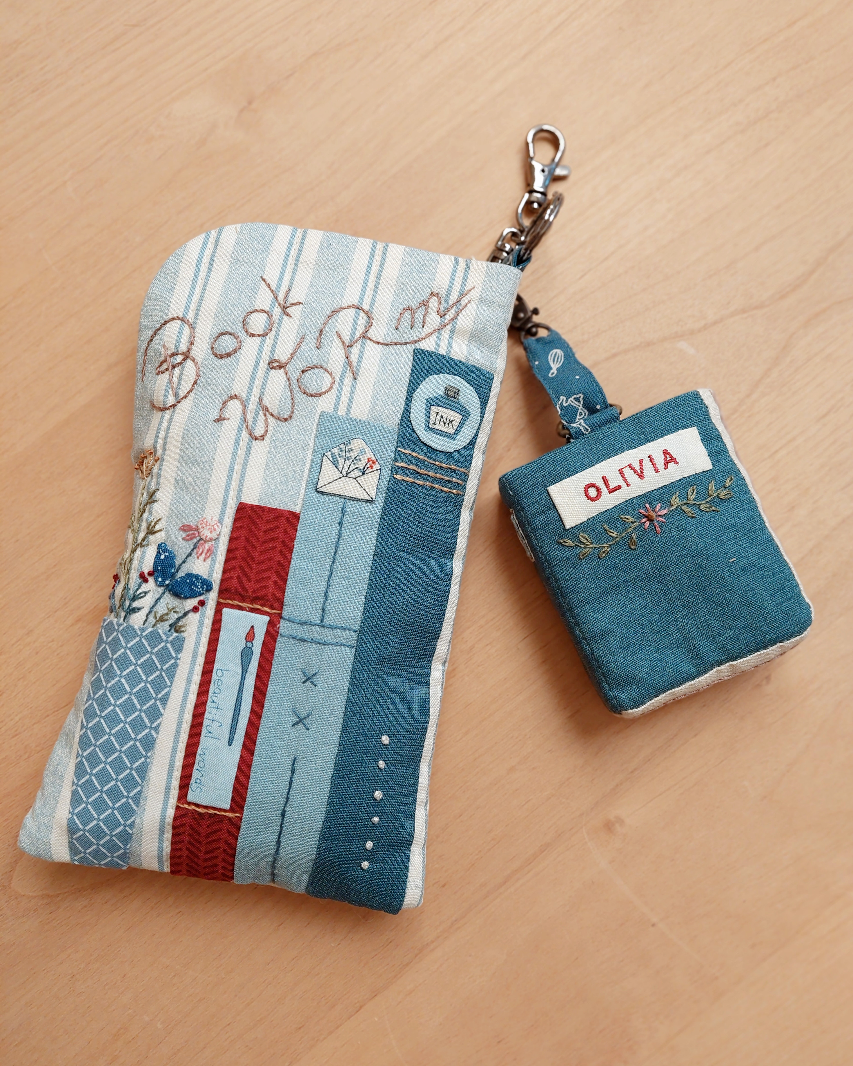今回の作品展のテーマ「Book」から、本棚をイメージした大きめポーチと本型の小さいポーチを作りました。大きめポーチはスマホや眼鏡など日常でよく使うものが入るサイズで、小さいポーチはイヤホンやちょっとしたものを出し入れするのに便利。もうバッグの中でゴソゴソ探さなくていいですね。